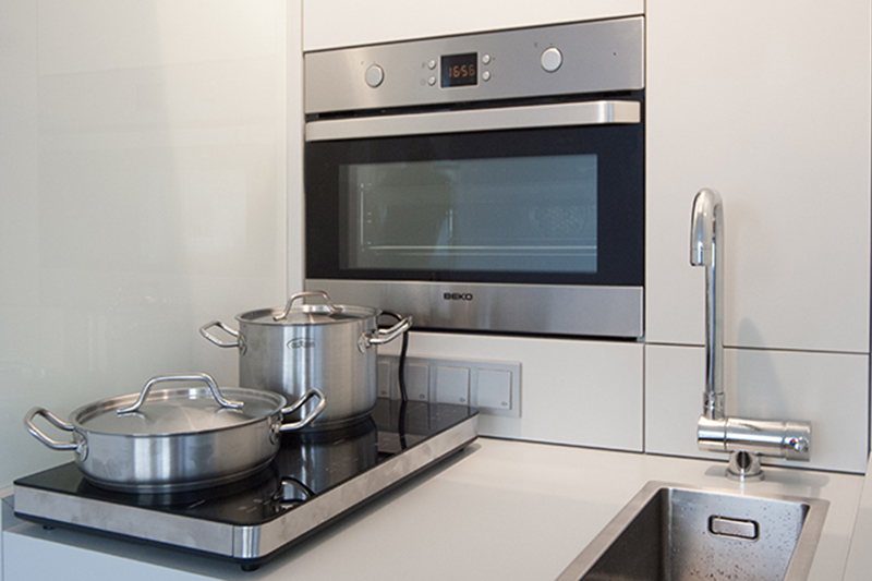 Auf 90cm Breite die geballte Kompetenz einer großen Küche mit Backofen, Herd, Kühlschrank und Spüle. ""
