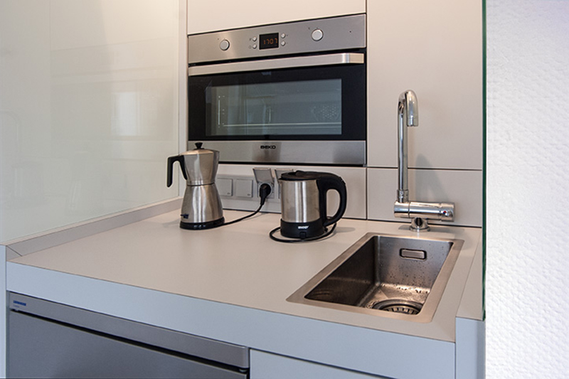 Auf 90cm Breite die geballte Kompetenz einer großen Küche mit Backofen, Herd, Kühlschrank und Spüle.