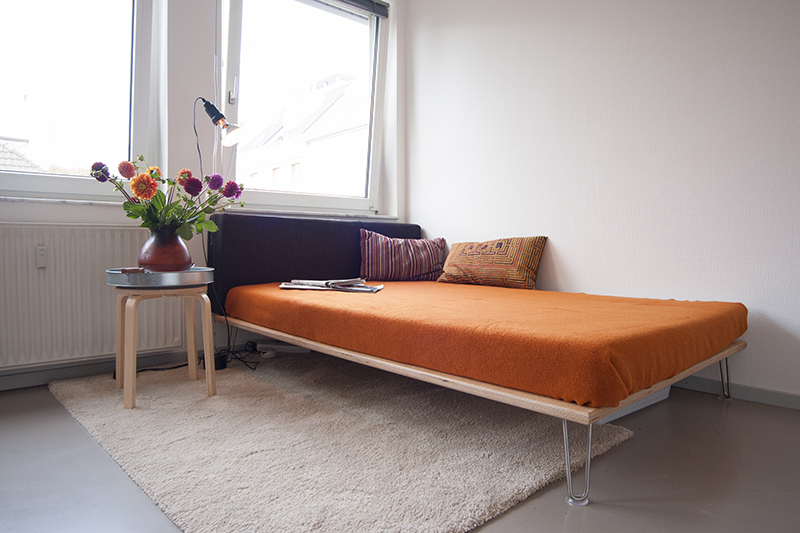 Löchrig und leicht scheint das Day-Bed im Stil der 50er Jahre mit einer Auflage aus gelochtem Multiplex im Raum zu schweben. ""