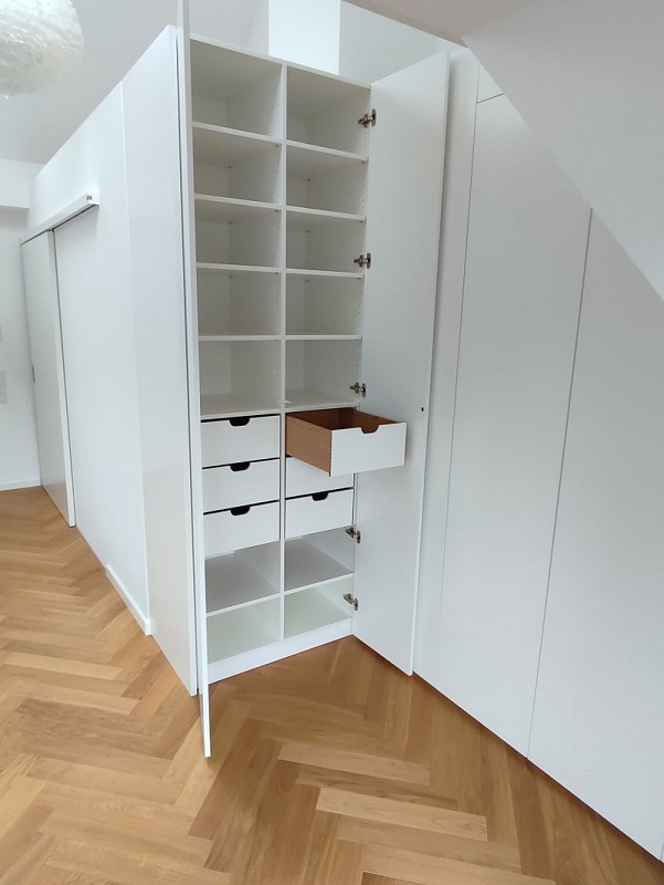 Einbauschrank Lack weiß, perfekt in die Raumnische eingepasst.